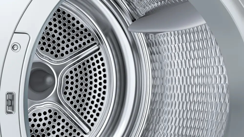 Sensitive Drying System: nagyméretű, nemesacélból készült dob textilkímélő kialakítással és emelőlapátokkal.